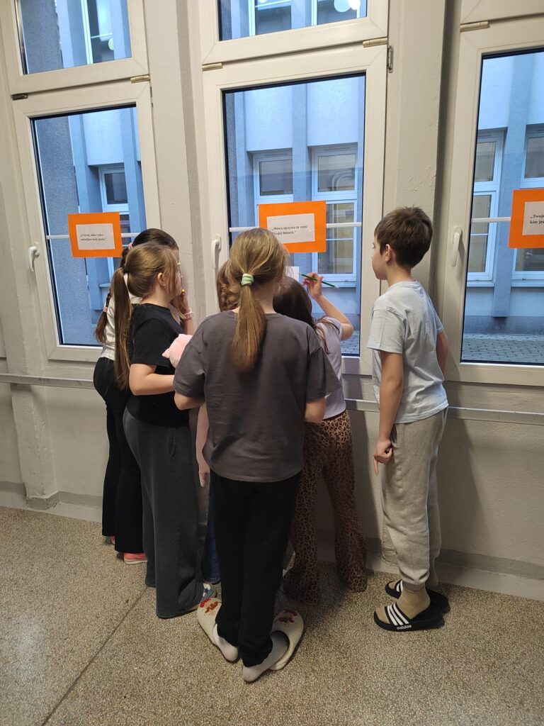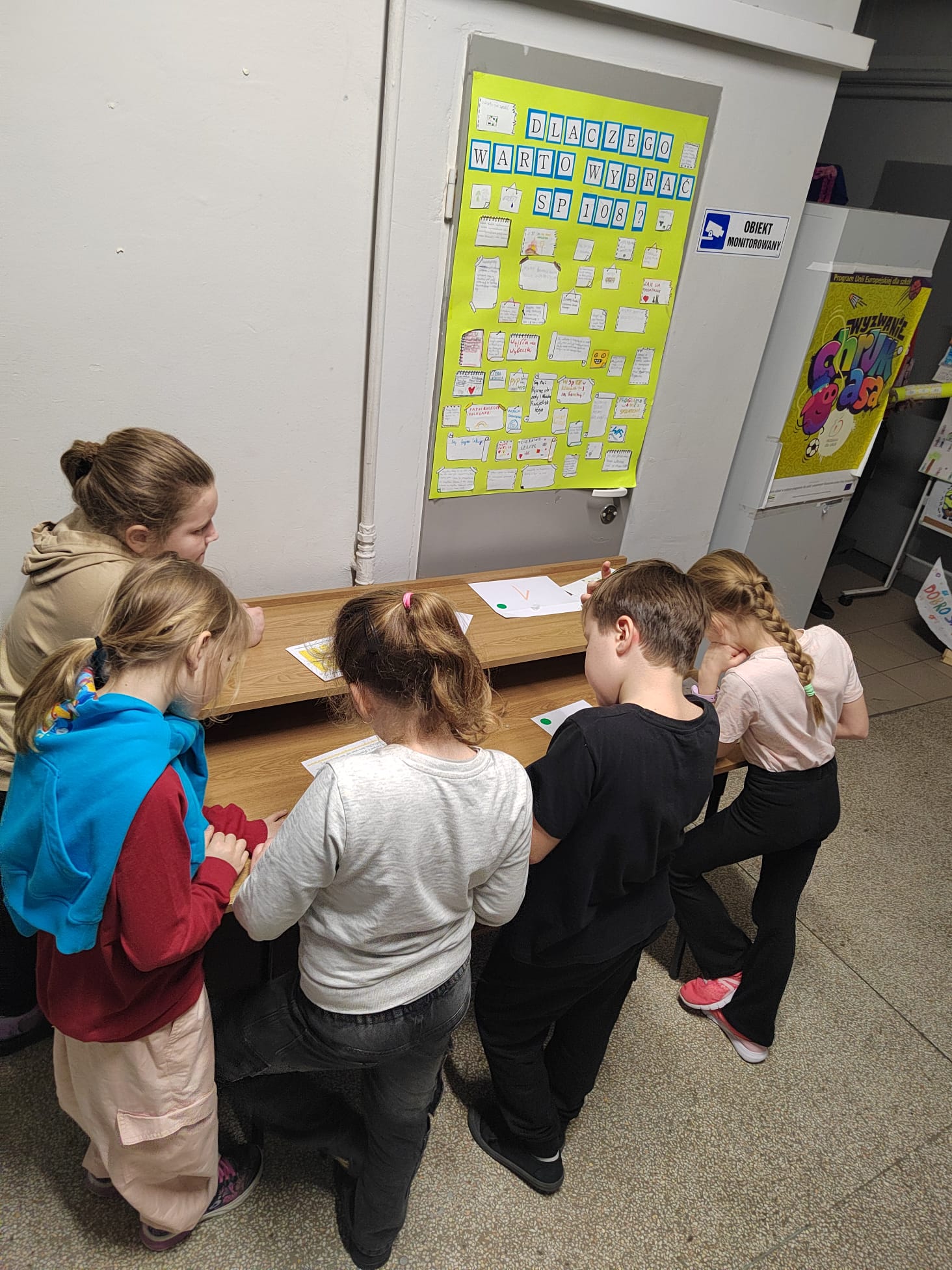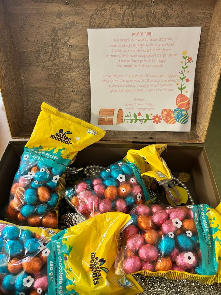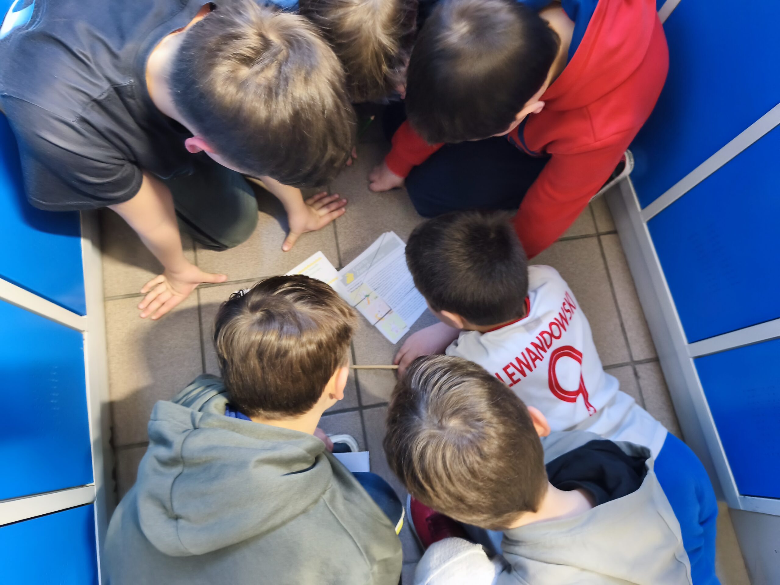 Wieczór rozpoczął się od poszukiwania ukrytych czekoladowych jajek – nie było to jednak takie proste! Aby odnaleźć „skarb”, uczniowie musieli zmierzyć się z wieloma łamigłówkami i sprytnie rozwiązywać kolejne zagadki, aby otrzymać wskazówki do miejsca, w którym on się znajdował. Nie zabrakło też pysznej pizzy oraz tortu urodzinowego dla jednego z uczniów klasy 2a.