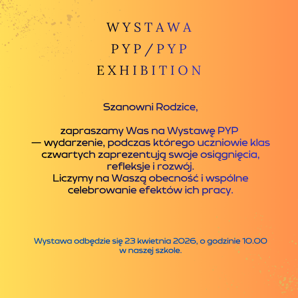 Zaproszenie na Wystawę PYP Przed nami Wystawa PYP 2026. To wyjątkowa okazja dla uczniów, aby pokazać swoje umiejętności badawcze, analityczne i prezentacyjne. Podziel się:Udostępnij na Twitterze(Otwiera się w nowym oknie)Kliknij, aby udostępnić na Facebooku(Otwiera się w nowym oknie)Kliknij, aby udostępnić na Google+(Otwiera się w nowym oknie)Dodaj do ulubionych:Lubię Wczytywanie... Podobne